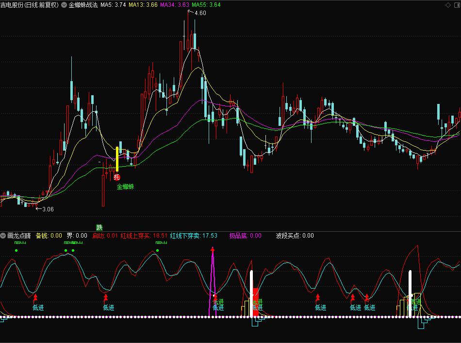 2、案例二:TCL集团(000100)该股在季量托的支持下走出了一阳上穿金蜘蛛的走势,股价放量突破金蜘蛛上平台应跟进。在金蜘蛛出现后应逢低买入,及时抄底,抓住的是大涨。