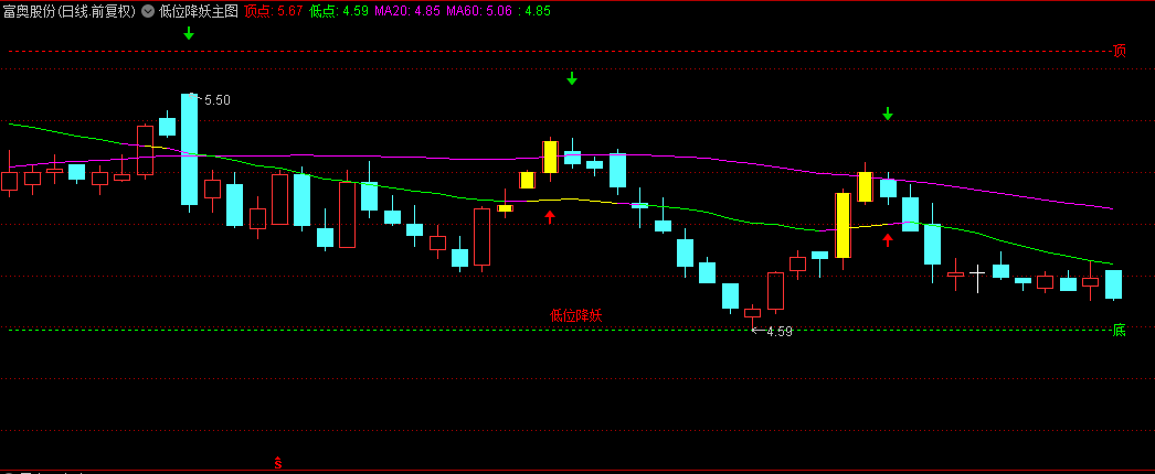 顶底之间的两条虚线是均线,20日和60日,如果股价在20日线上方,曲线会显示黄色,反之则显示绿色;
