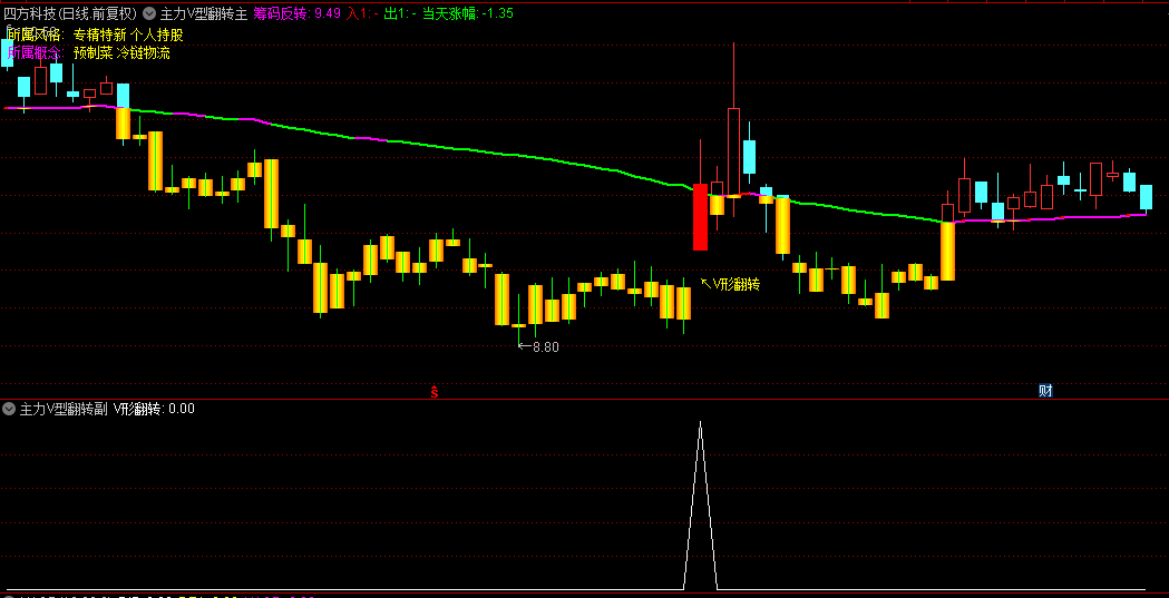【主力V型翻转】主图/副图/选股指标,V型突破擒龙信号准,价格突破筹码线时,发出V形反转信号!