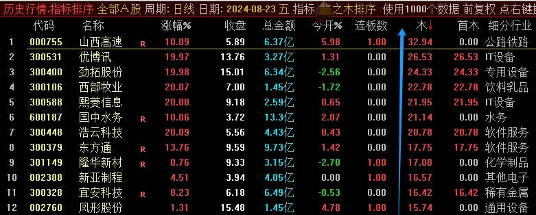 3、木信号,意思是当日竞价表现最为强劲的个股,包含连板股与首板股1