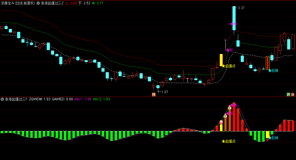 2、规避弱势区域:若K线位于主图三线之下,表明市场可能处于弱势或调整阶段,此时应保持谨慎,避免盲目介入。除非出现明确的“反转”信号,该信号预示着市场即将改变方向,转为上升趋势,此时可适度关注并准备布局,但操作前仍需谨慎评估。