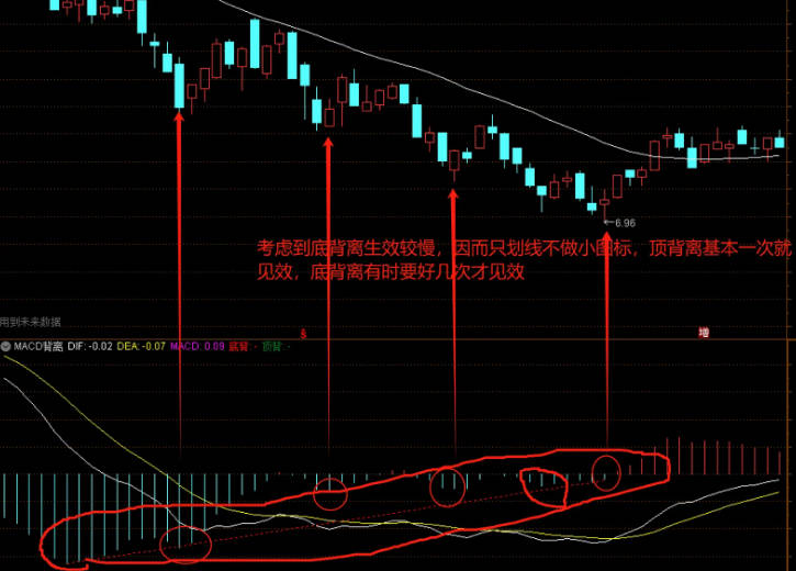 应友友要求编个与众不同真正的以MACD量柱高低为核心的真正背离副图,网上的MACD带背离的副图很多,但看到的都是以快慢线金叉死叉点为核心的计算方法,说句实话用处不大,因为等到快慢线的金叉和死叉信号延迟滞后性太大了,等你发现后股价已经降下来了,真正能让你及时处理的肯定是柱子的高低,所以这个指标价值自已估量,大家都知道顶背离一般出现了较容易立马看见效果,底背离一般要三四次才能反转,所以我只在顶痛离上标小人信号,底背离只划线不标小图标,免得看了手痒爱动,因为是画线所以本指标带未来涵数 ,还有加密不想让人乱抄乱改,当然这是挡不住大神的,也请尊重下编之不易,能解的自已研究去好了,如果下载本指标默认为你认可,不要下载了又说什么不好之类。