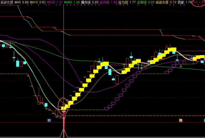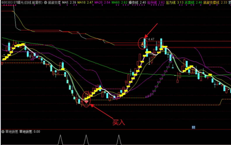 但是仅仅1.底部支撑以上还不够,还必须要有2.买卖线以上和3.五日MA拐头向上。五日MA比操作线灵活准确多了,所以,用五日MA代替了操作线。