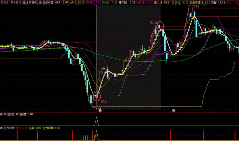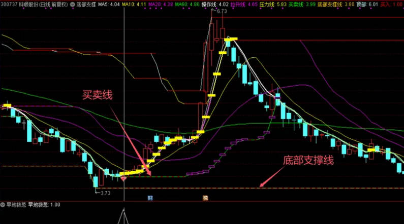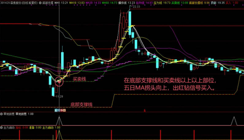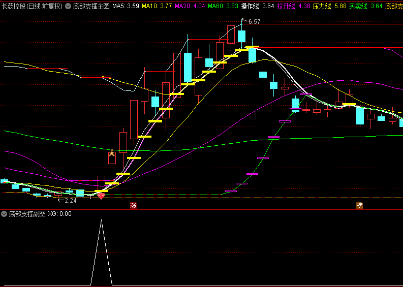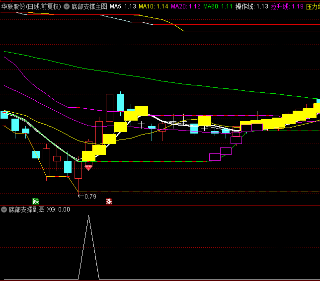 今天分享的是底部支撑主图和选股指标,就是在底部支撑线和买卖线以上部位,五日MA拐头向上时买入,买入信号及时准确。
