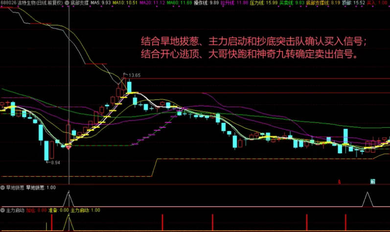 为了避免站在高岗上,以致到手的利益丢失掉,卖出信号也是必须的,所以,借鉴大哥快跑等指标的代码添加了卖出信号。