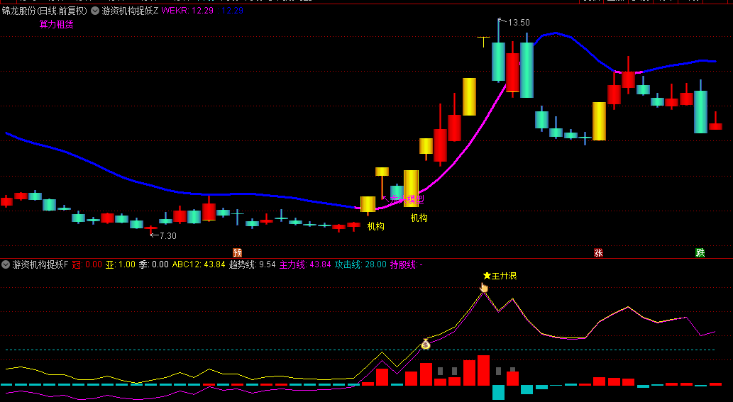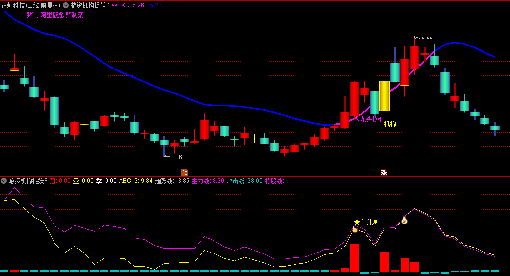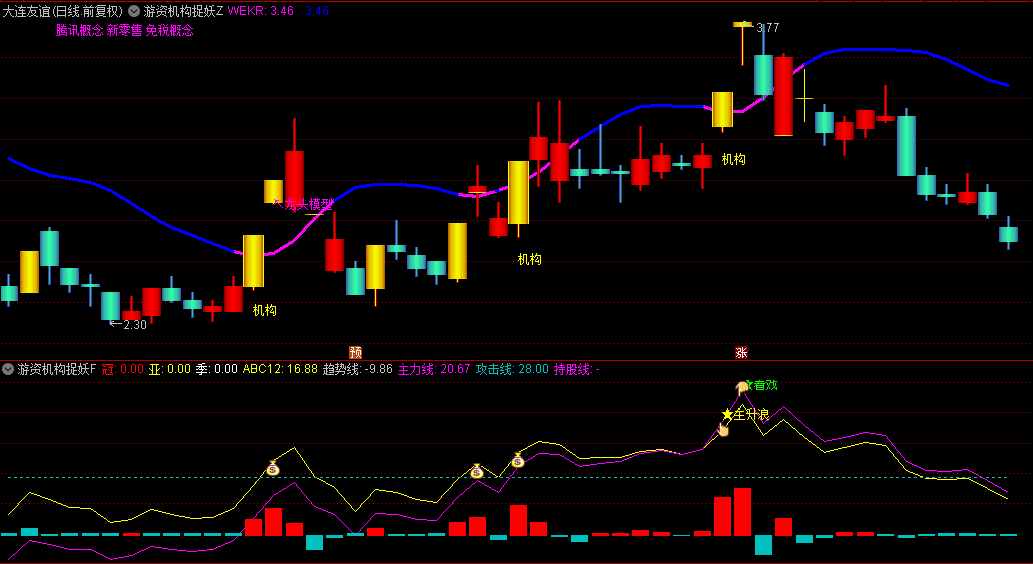 二、妖股趋势线的独特标识:在副图区域,特别加粗的洋红色线条被赋予“妖股趋势线”之名,它如同妖股的隐形轨迹,清晰勾勒出潜在妖股的上升轨迹,为投资者提供明确的跟随方向。