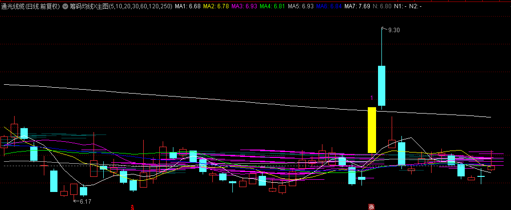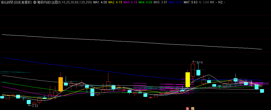 筹码均线指标,从几个别的指标改装来的,感觉用来追涨打板好使,只要离上个筹码密集区有空间就敢追感觉这个比直接看软件自带筹码峰的好处在于,筹码的观察重点在于观察其动态变化,紫色线条代表在这里出现过最高的筹码峰,比软件的筹码峰更直观。