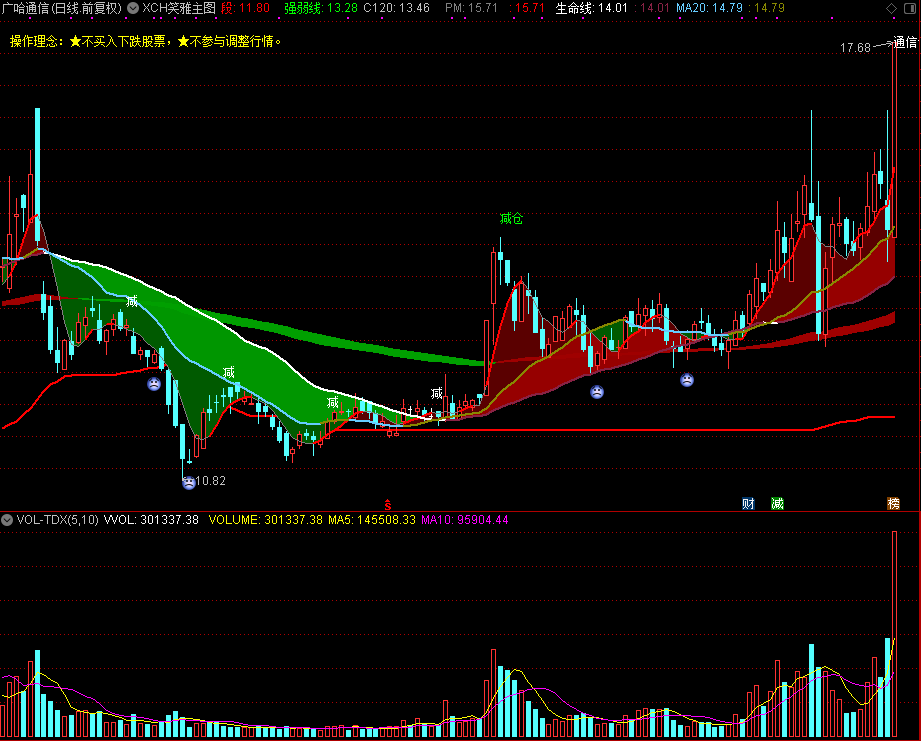 DRAWTEXT_FIX(C>0,0.01,0.03,0,'操作理念:★不买入下跌股票,★不参与调整行情。'),COLOR00FFFF;