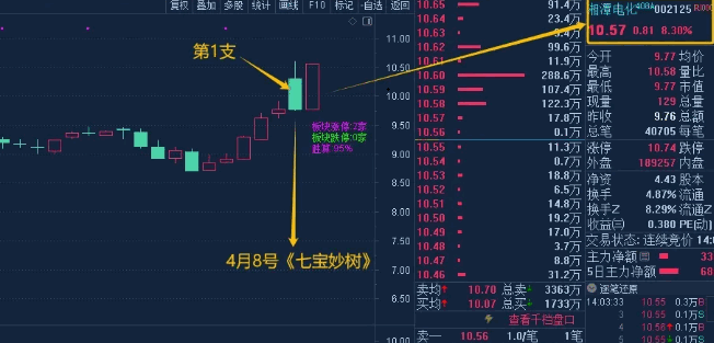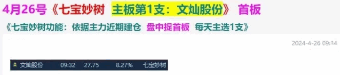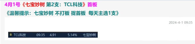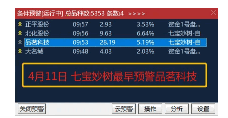 4月11日 9:53分 七宝妙树最早预警出票品茗科技,预警3%左右,尾盘8.51%,当日空间5.51%
