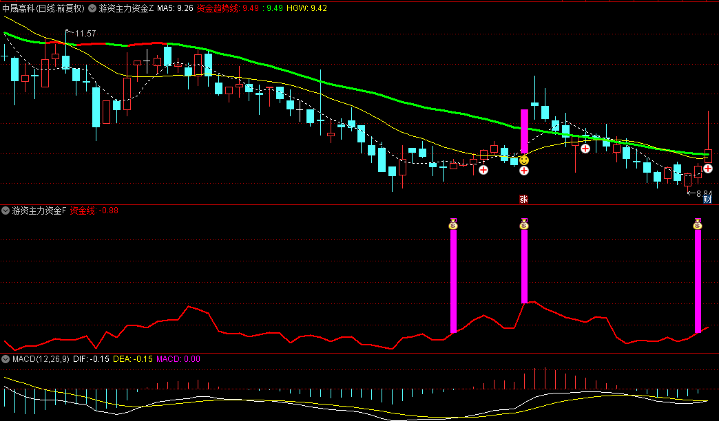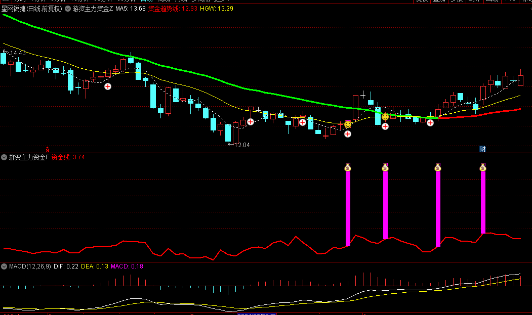 3、副图”钱袋子“紫柱为资金运行买入信号,它是由趋势上穿资金线构成;