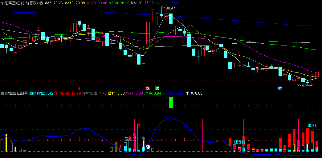 今选【吸筹建仓】副图/选股指标,主要用于抄底,红色量柱+紫色量柱重叠出现是最佳建仓位置!