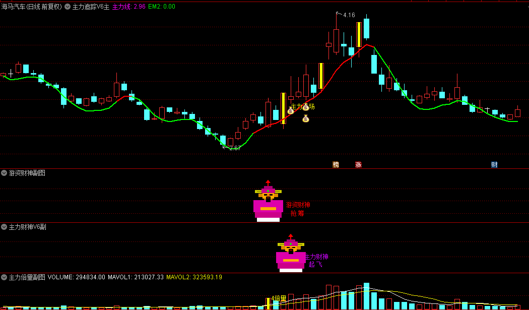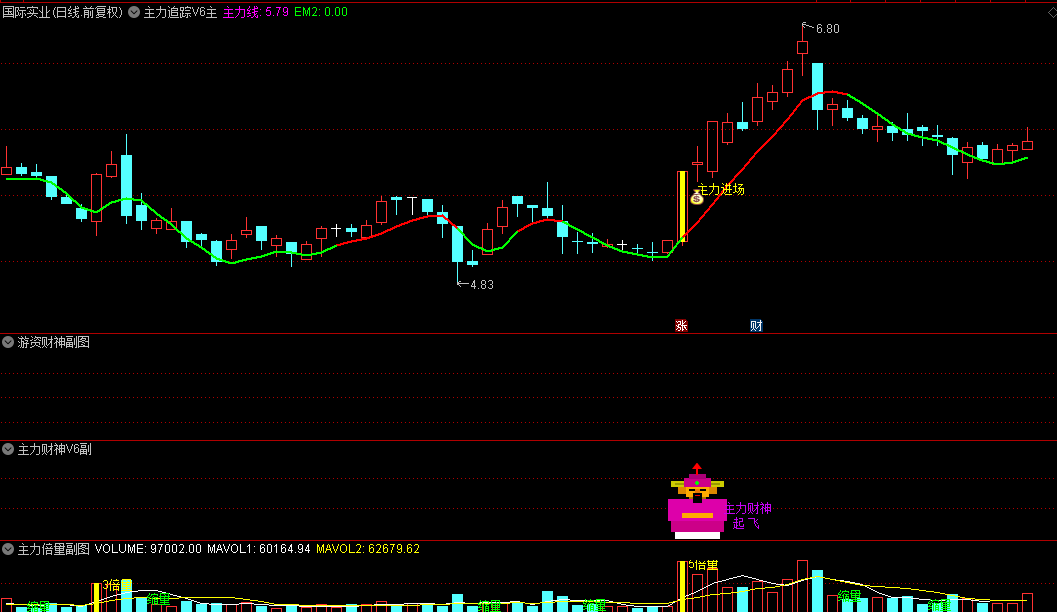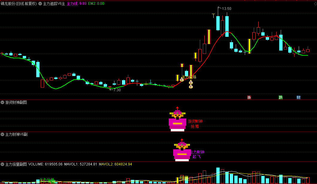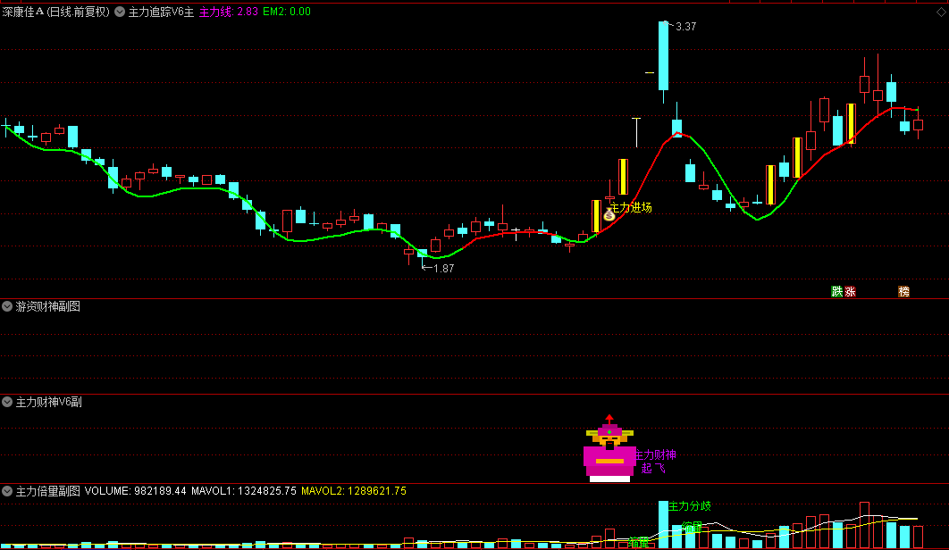 某音热门带评分和倍量附图主力财神来了两个版本的综合体,此指标计算主力资金和游资抢筹流入拉升情况,属于激进模式跟着主力游资上车吃肉,有量之后上车更安稳有评分主图给走势打分,财神副图出现财神图标带量上车起飞。