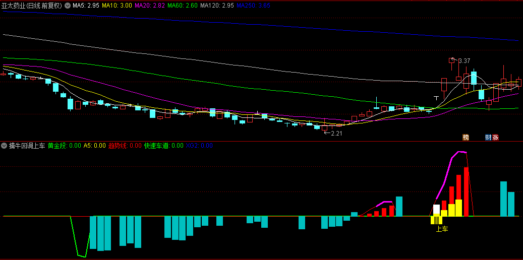 指标包括一附图,一选股指标,原来是上车擒牛,但信号出现基本上都是涨停所以做了优化后信号适合当日开盘选股思路,虽然信号当天不固定,只有当收盘后信号固定不会消失,所以这个需要自己把握了,但建议使用的话就是当日竞价或者开盘绿盘低吸思路,可以设置预警这样能方便盯盘,手机电脑通用,手机需要手动选股了,信号仅供参考