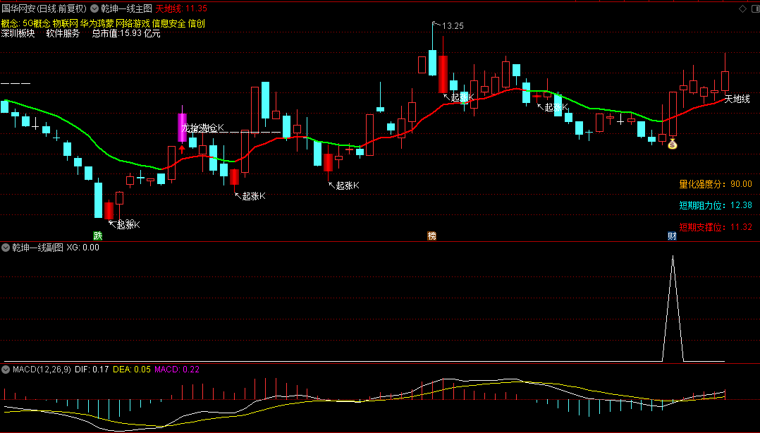 5、右下角显示短线的压力位和支撑位价格,以及量化强度评分数值,数值越大越好