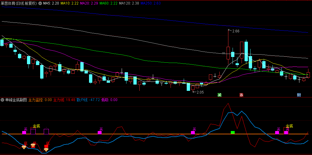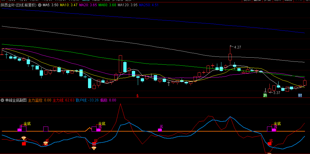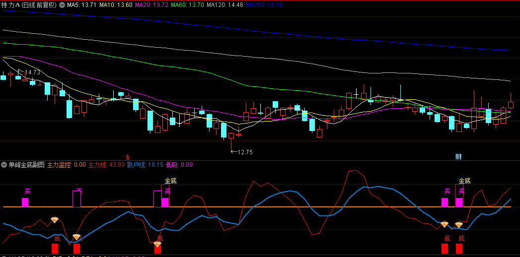 【单峰金底】副图/选股指标,主力线上穿散户线 同时主力线<-10,指标不含未来函数!