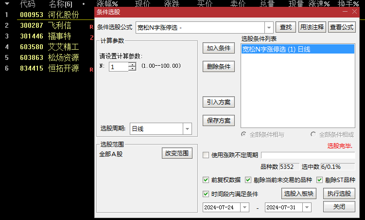 探寻N型涨停的奥秘,其左侧首个涨停板的收盘价相较于过去60个交易日内的最低点,其涨幅被设定为一道门槛,传统上不超过30%。然而,为了拓宽视野,捕捉更多潜力股,我们可灵活调整这一界限,比如放宽至50%,让选股范围更加宽广。同时,正确配置N参数的关键步骤不可忽视,如图示精心设定,以精准锁定目标。