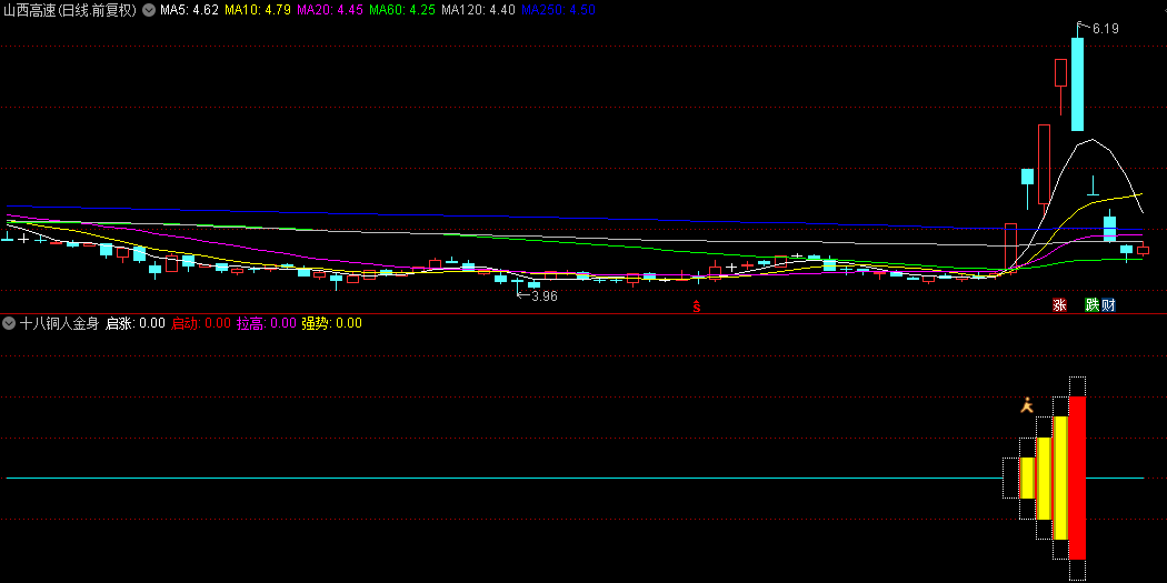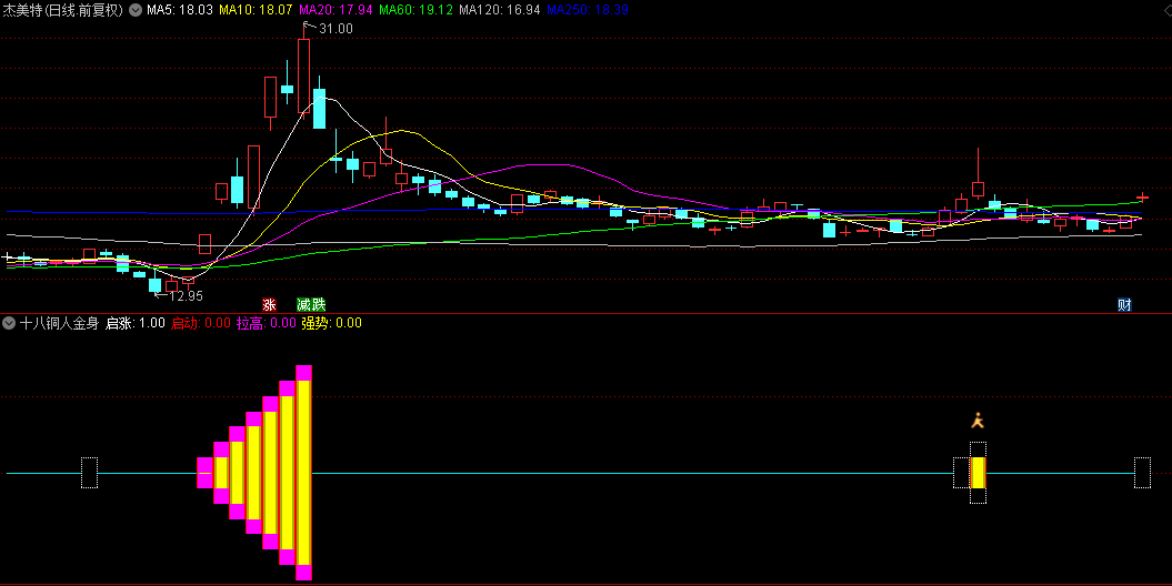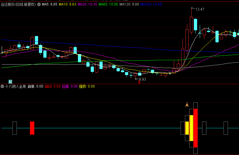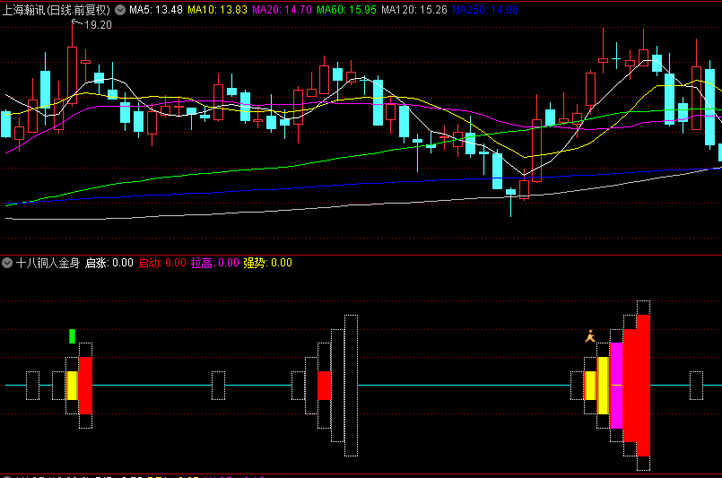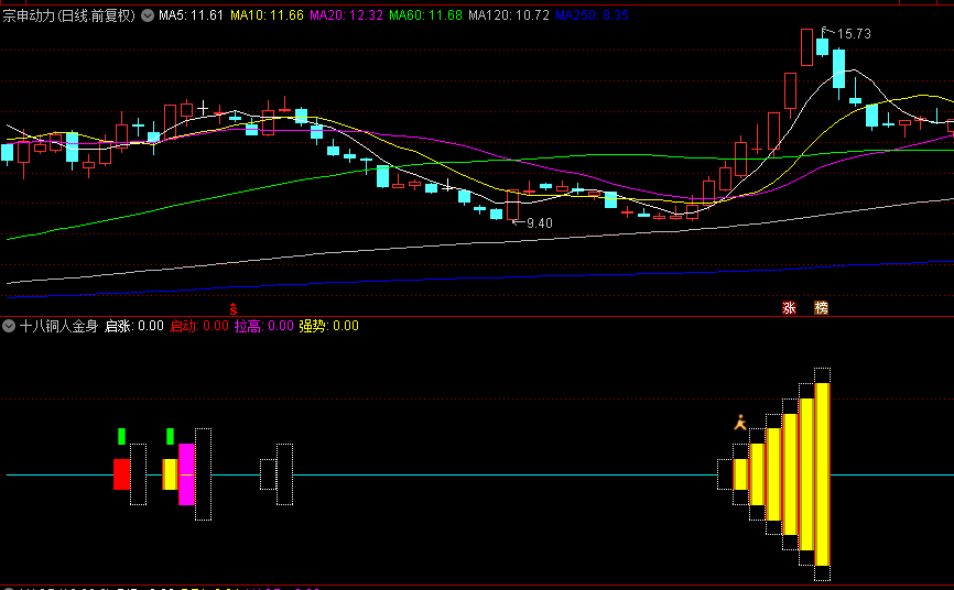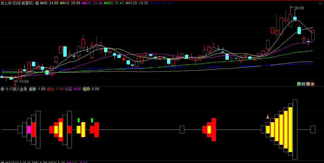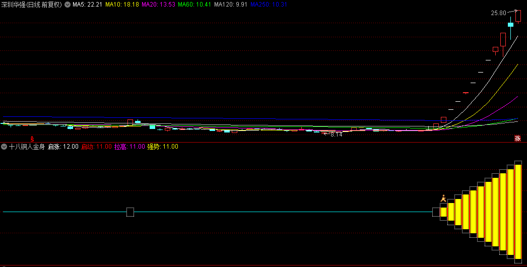 上图案例是深圳华强的走势图,可以看到,图中的铜人出现的时候,是进场的时机,后面只要一直保持黄色柱子的显示,就可以放心持股,甚至在中途开板的时候,只要黄色柱子不消失,就可以大胆加仓;