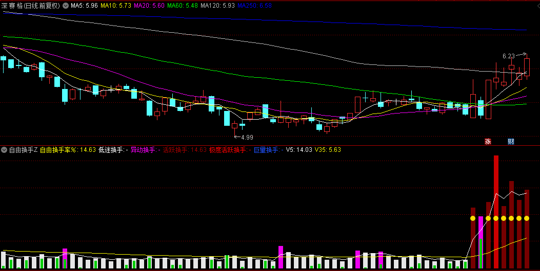 图中出现黄色圆点的时候,代表当天的自由换手z大于10%,是极度活跃的一天;