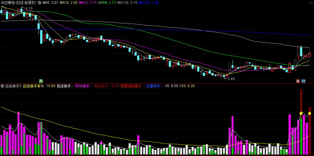 【自由换手z】副图指标,以自由流通股本为分母计算的换手率更贴近市场,妖股必从换手出!