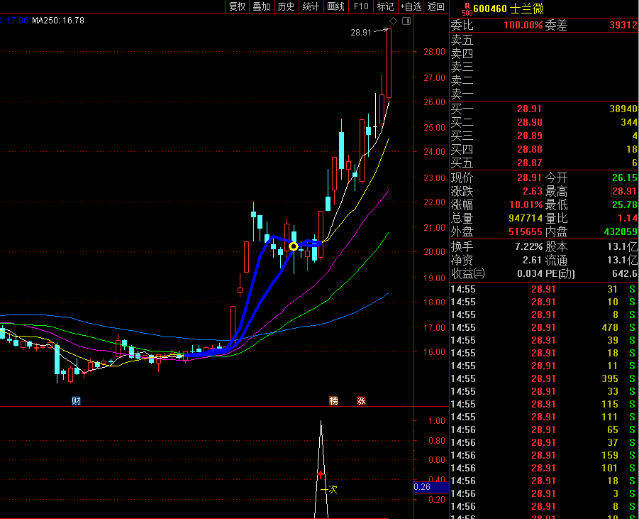 3、当股价放量冲过鸭头顶瞬间时介入。