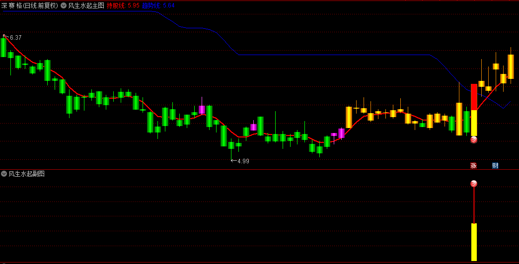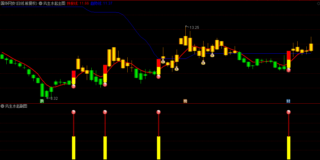 6、同时站上红色持股线+蓝色趋势线之上的金色K线才出“钱袋子”信号。