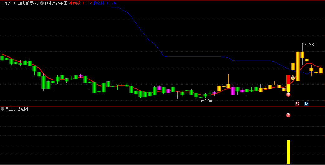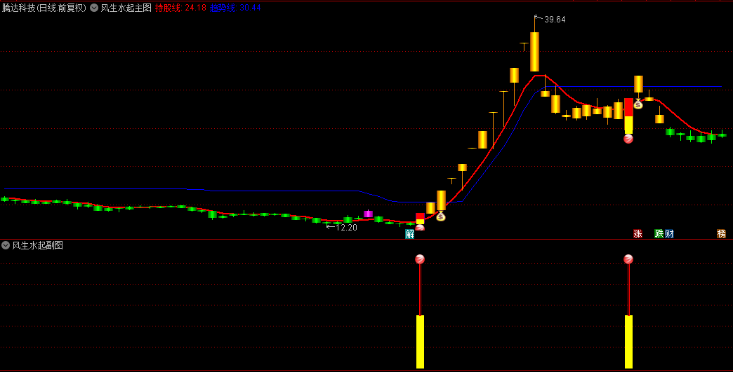 今选【主力风生水起】主图和副图选股指标,蓝色K线是由强转弱信号,主力筹码擒龙信号准!