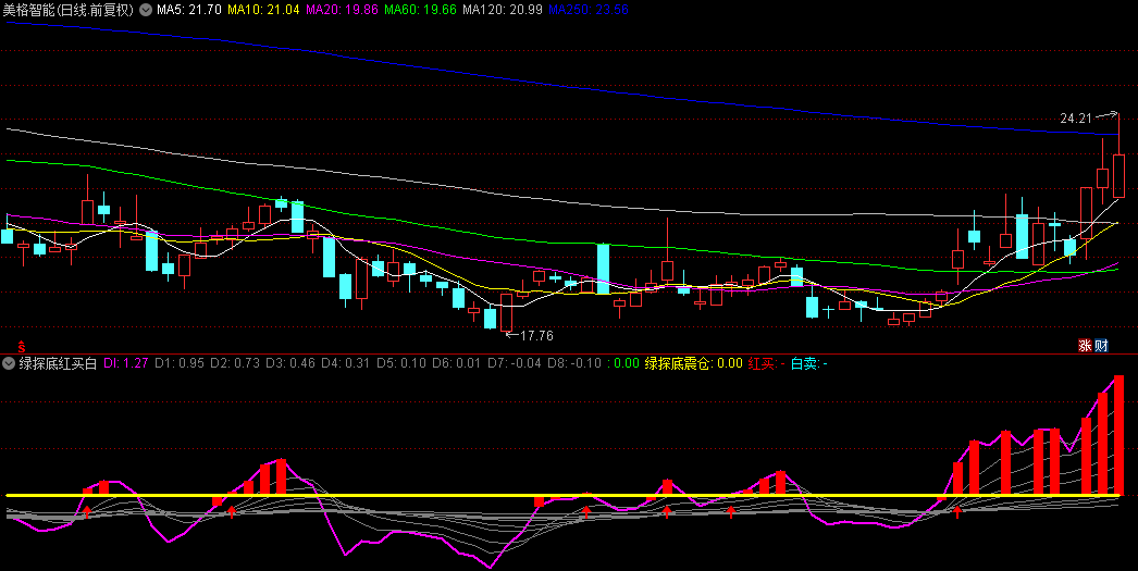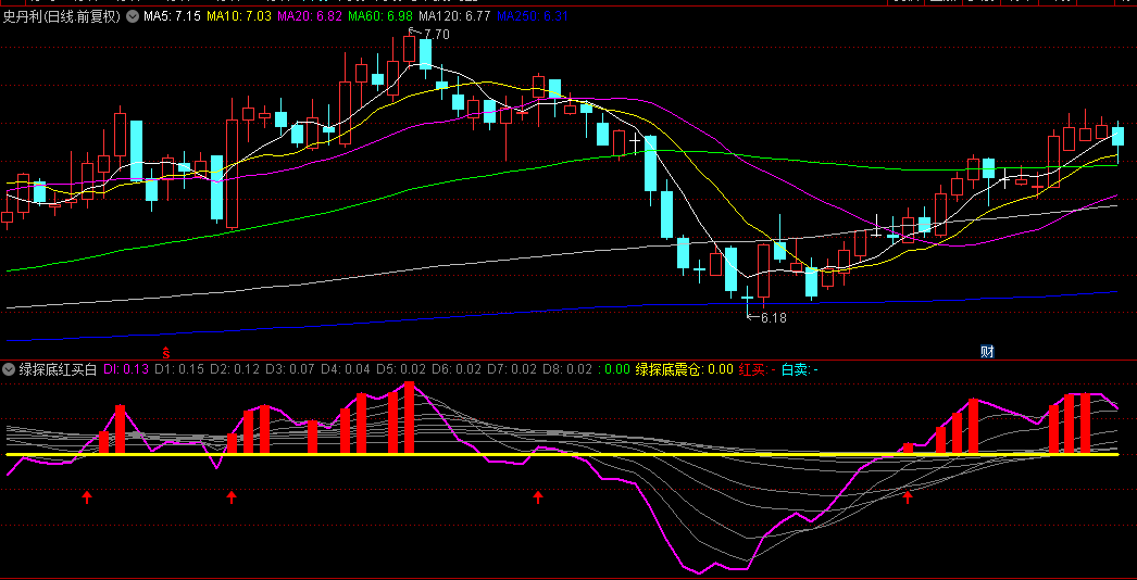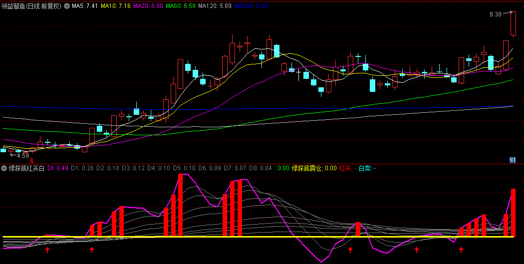 【绿探底红买白卖】副图指标,紫线强势上穿,红柱不断逐日伸长,抓住机会持票!