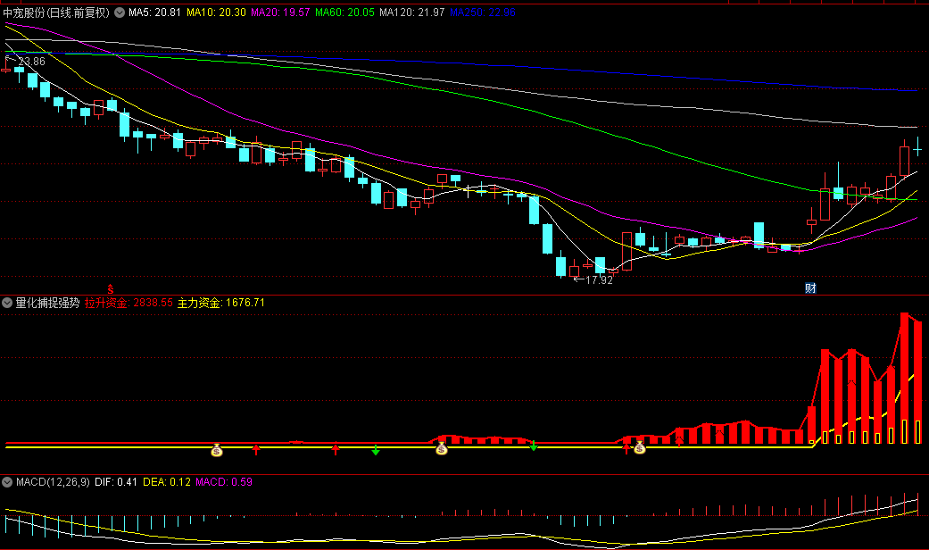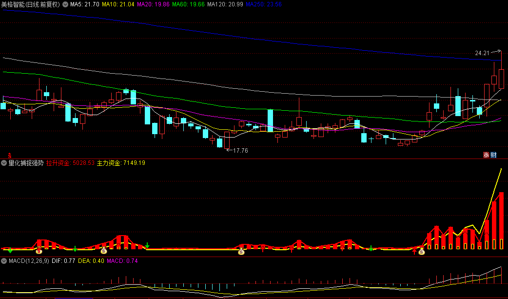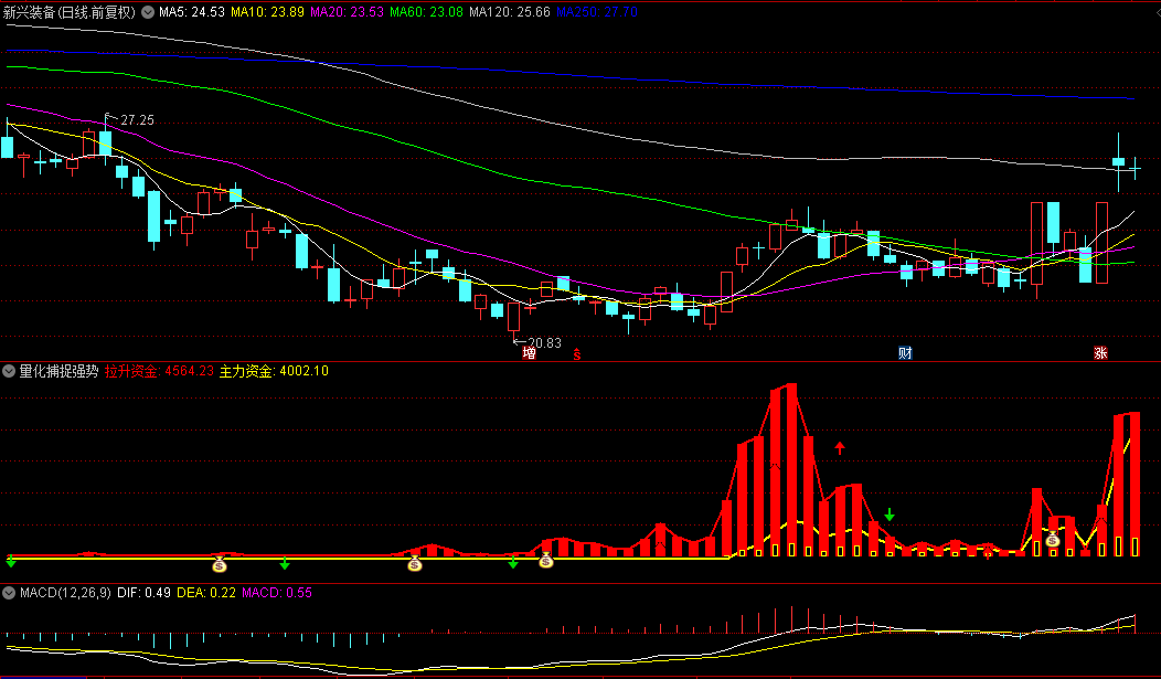 量化捕捉强势股副图指标,特别设计了两种鲜明的颜色来直观展现市场资金的动态:金色代表主力资金的稳健布局,而炽热的红色则象征着强劲的拉升资金流。