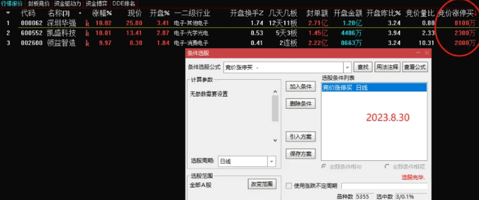 选出来的股票,点击“竞价涨停买”数据,就和排序指标排序的结果是一致的: