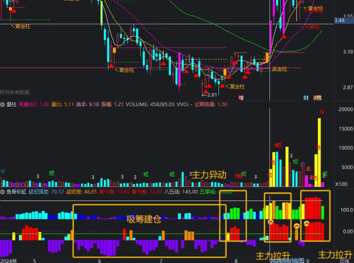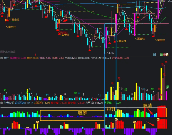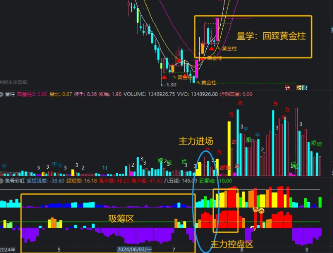 举几个例子,国中:前期有一段时间的吸筹,然后主力有异动,出现试盘洗盘动作,最后按照量学知识,选择二波入场时间,国中就是缩量到黄金线附近。