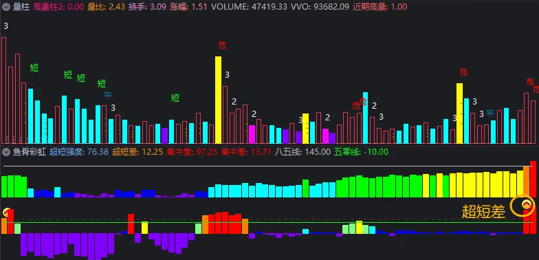 用法四(核心):超短差选股,一旦超短强度和集中度度达标,就会提示小箭头,这个可以用于预警,上周抓了四个涨停就是靠此方法,再结合量价分时进行筛选。