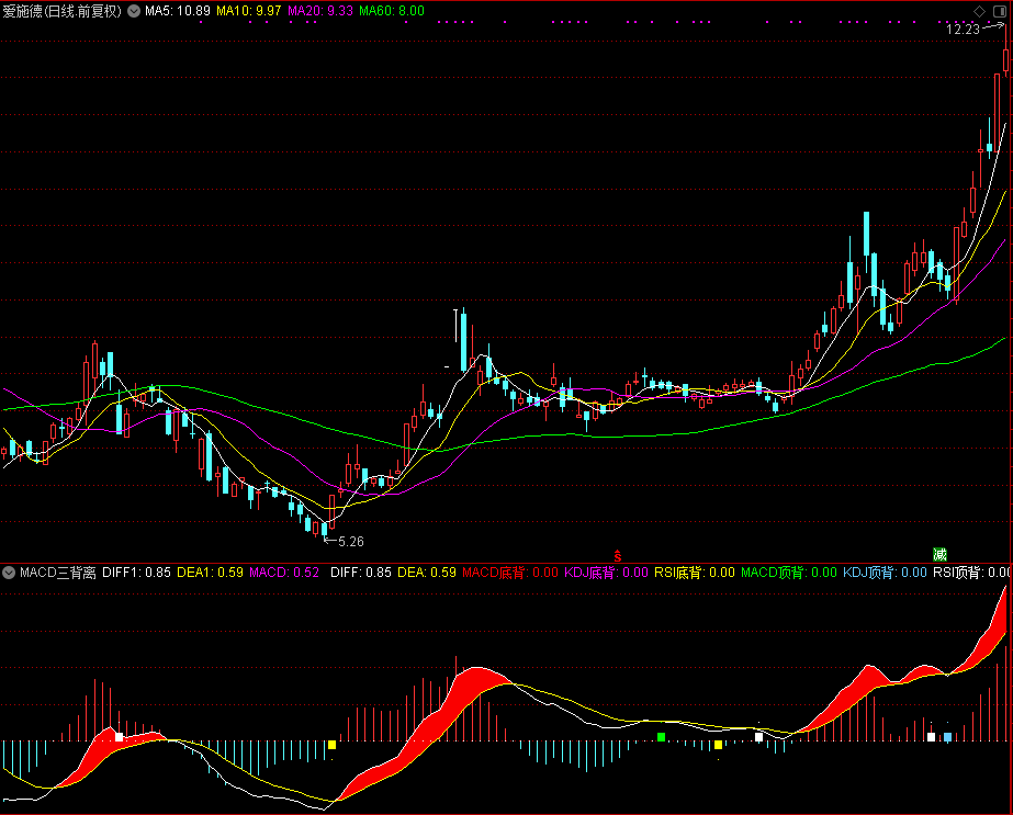 MACD顶背:IF(D1>0,0.1,0),COLOR00FF00,POINTDOT;