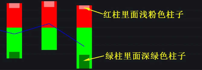 该副图指标放大效果如下图,红色柱子代表龙虎榜的总买入金额,里面浅粉色柱子为机构买入总金额,剩余即为游资买入总金额。绿柱柱子代表龙虎榜的总卖出金额,里面深绿色柱子为机构卖出总金额,剩余即为游资卖出总金额。
