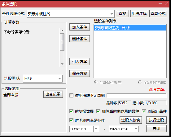 指标不含未来函数!值得注意的是该指标选股数量极度少,8月才1只,6月7月都没有信号,介意者勿拍!