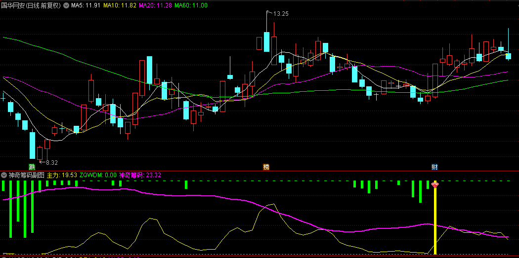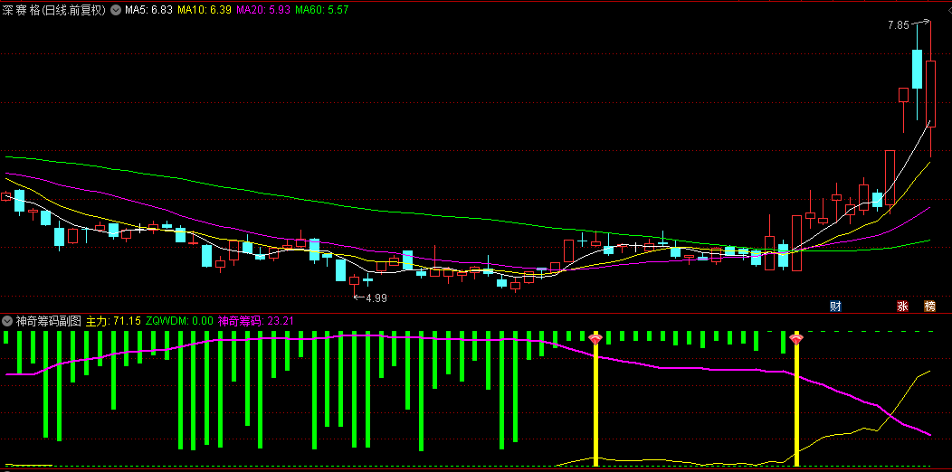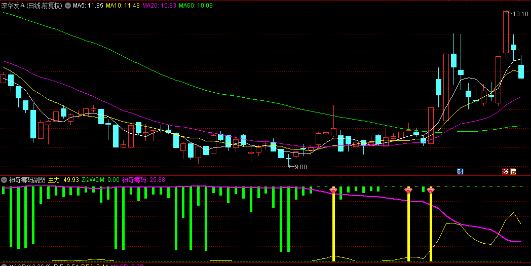 【神奇筹码】副图/选股指标,出现黄柱红钻石信号,表示主力进场!