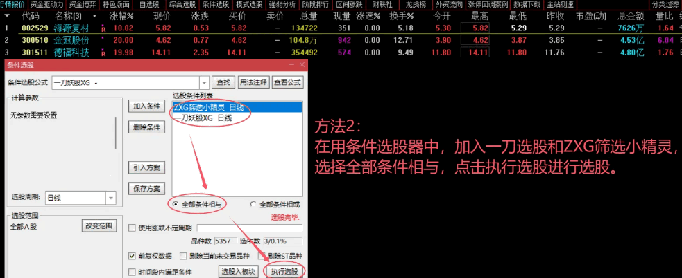 下面以一刀妖股指标为例,介绍ZXG筛选小精灵的三种使用方法,请看下面贴图的文字说明: