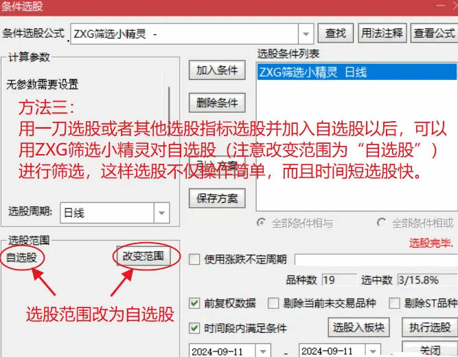 5.ZXG筛选小精灵作为自选股筛选指标,可以筛选任何选股指标选出来的股票和自选股的股票,不仅仅一刀妖股指标。