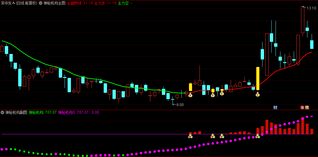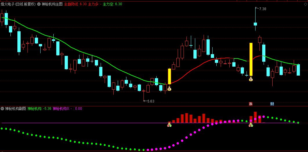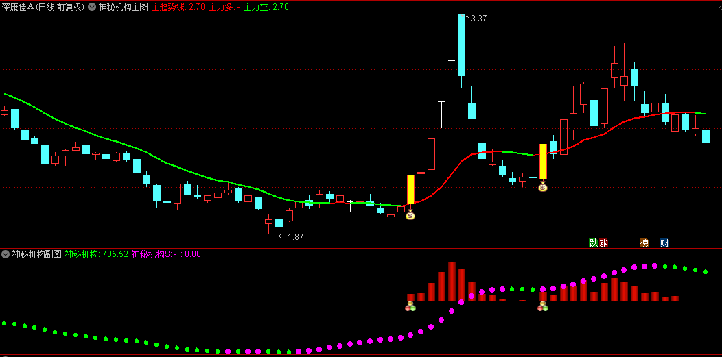 当主图红线+副图红柱+副图洋红色圆圈在同一时刻璀璨绽放,形成强大共振效应,系统即发出“钱袋子”买入信号,此时副图亦会同步确认,此信号为选股黄金时机。