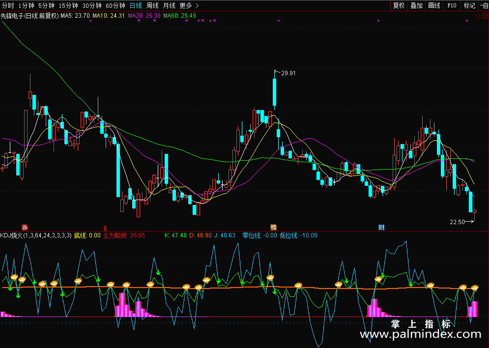 其实此指标就是KDJ指标的优化版,为什么起名叫“烧火”?就是里面添加了一个 主力吸筹 的粉红色柱体,仿佛像一堆正在燃烧的火堆......