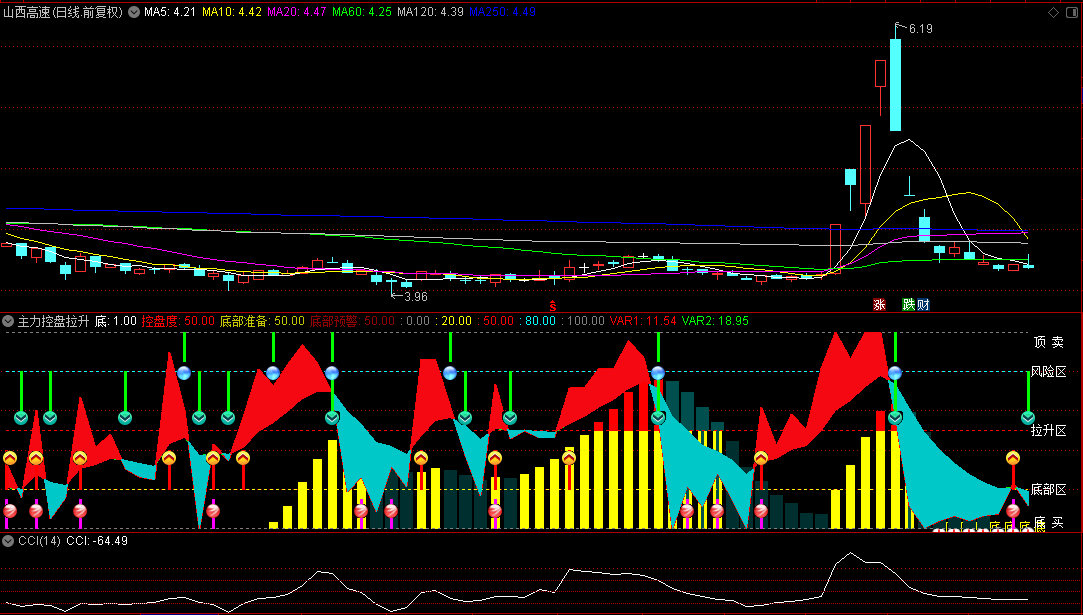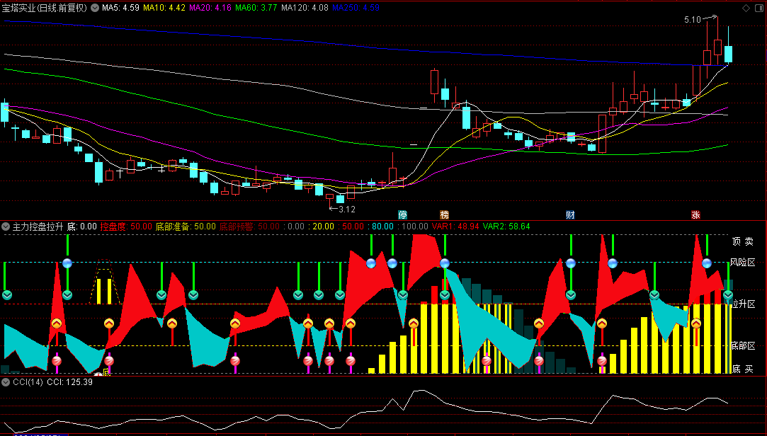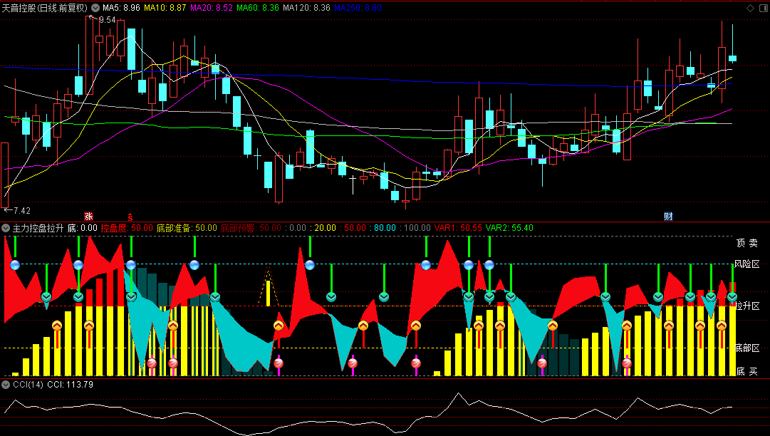 自己整理的一个主力控盘指标,将股价空间分为底部区、拉升区、风险区,方便你识别目前股价所处区域,同时对底买和顶卖给出预警信号!!!