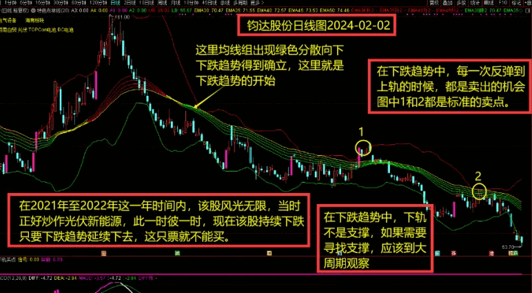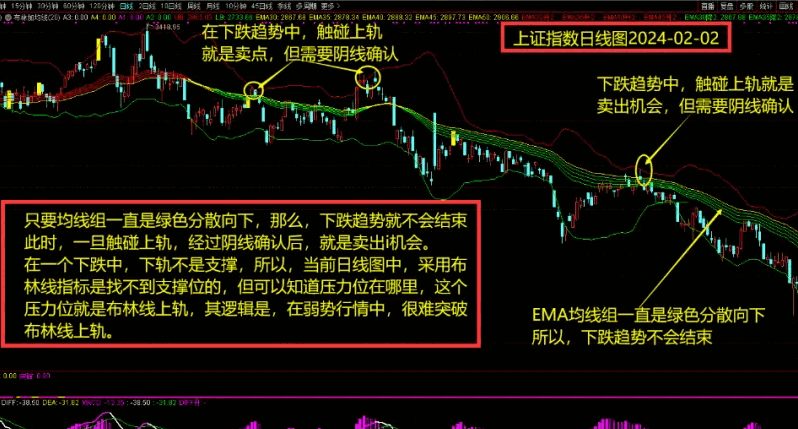 (2)当均线组出现绿色分散向下的情况时,此时是下跌趋势,这样,反弹到上轨就是压力,触碰上轨就是卖出的机会。当然,触碰上轨后,需要阴线确认。如果触碰上轨时,本身就是阴线,那么,此时就是卖点。如果触碰上轨是阳线,则需要等待下一根阴线确认后才可以卖出。