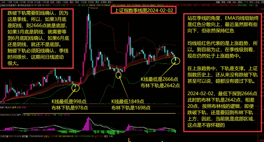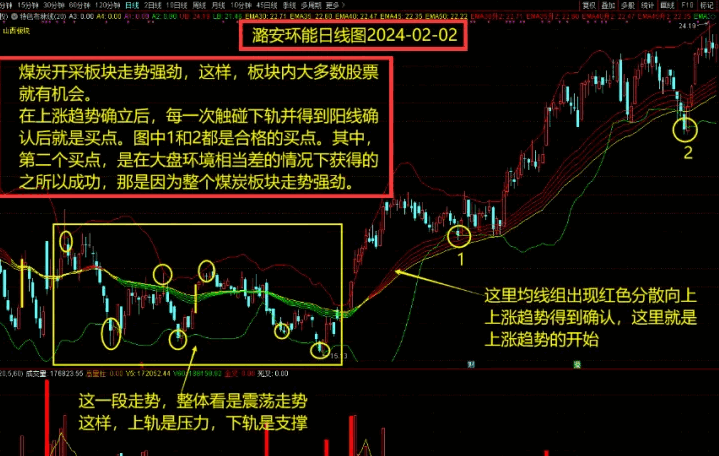 (1)在非常明显的上涨趋势中,下轨是支撑,在均线组保持红色分散的情况下,触碰下轨就是低吸机会,但触碰下轨需要阳线确认,如果触碰下轨本身是阳线,只是下影线触碰了下轨,那这里就是买点。如果触碰下轨是阴线,那需要等待下一根阳线确认才是买点。