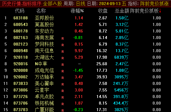 献礼 【阵前竞价抓涨停】竞价排序副图+选股指标,精准锁定即将启动涨停的强势个股!