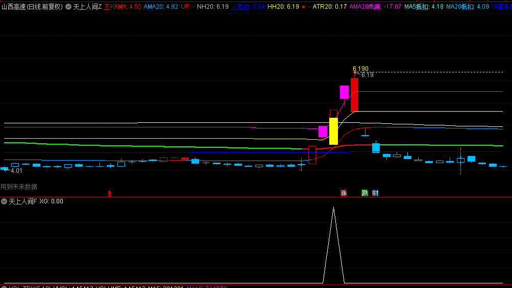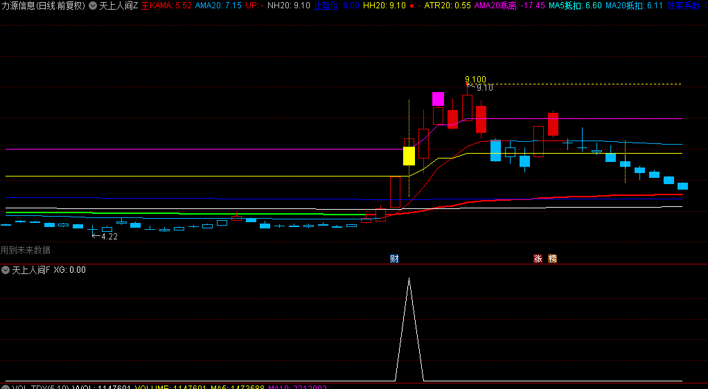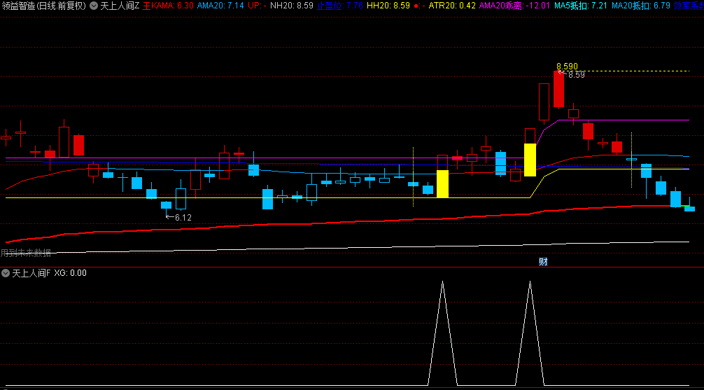 在主图中,我们巧妙地融入了未来函数,描绘出最新高点的黄色虚线轮廓。副图选股不含未来函数!