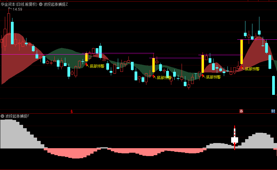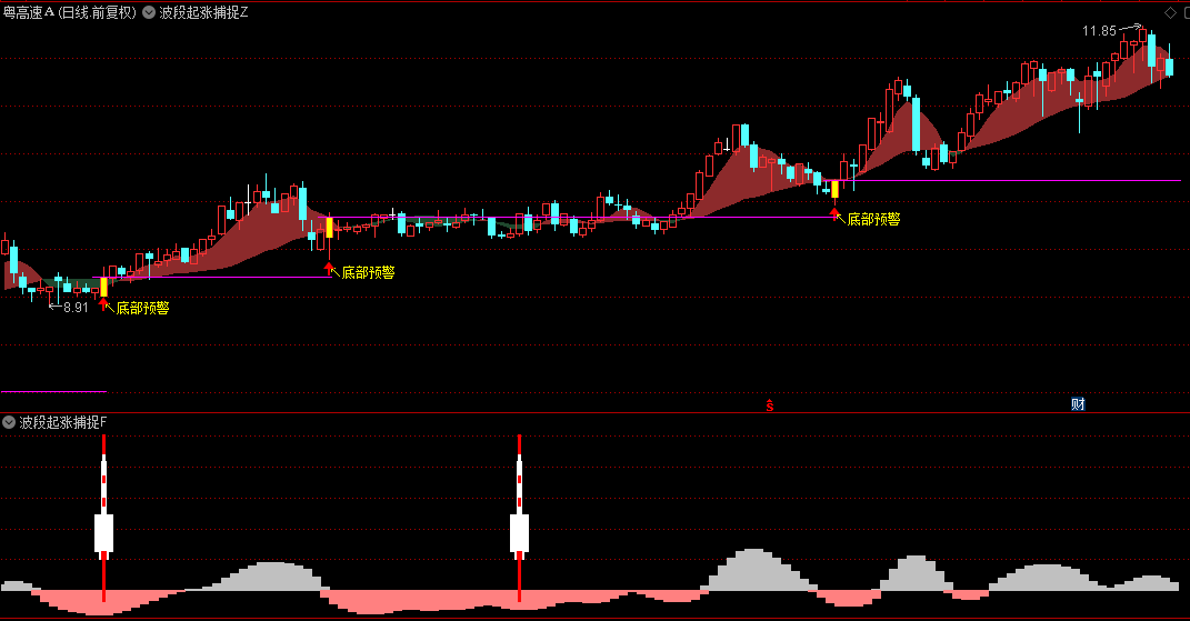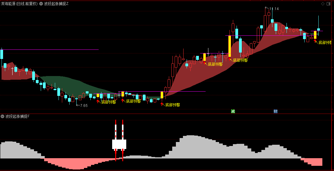 在主图中,我们特别设计了底部预警信号,这一信号如同灯塔,指引投资者捕捉到市场即将反转的微妙迹象。