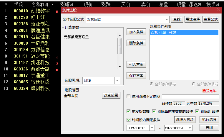 精选潜力标的:利用本策略精准筛选那些连续两日涨停后步入回调阶段的股票。这些股票如同蓄势待发的弹簧,一旦时机成熟,便可能再次爆发。