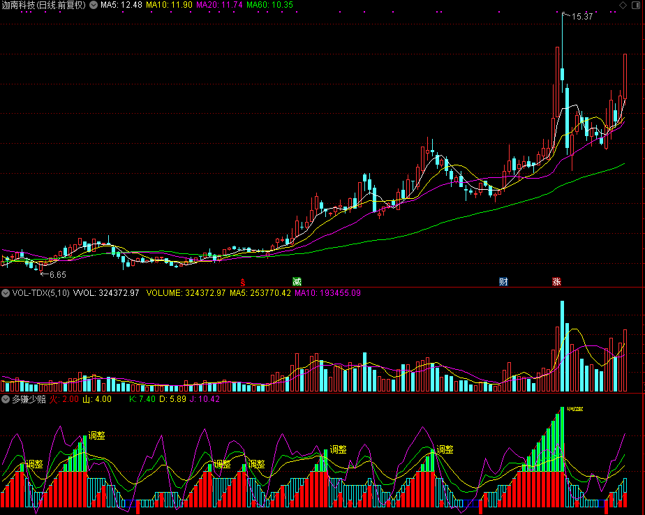 DRAWTEXT(REF(火,3)>0 AND REF(火,2)>0 AND REF(火,1)>0 AND 火=0 AND REF(火,1)>山,REF(火,1),'调整'),COLORYELLOW;