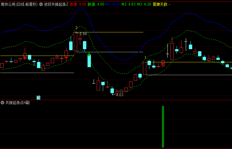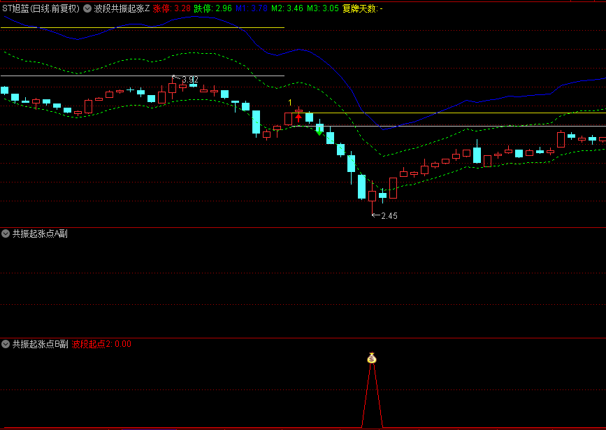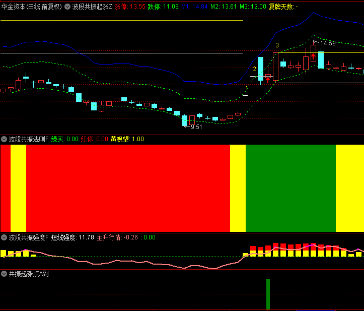 比如波段共振起涨Z主图出现红箭头,而同时共振起涨点A副图出现绿色柱子,就是一个共振点。