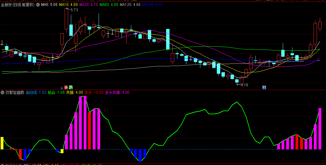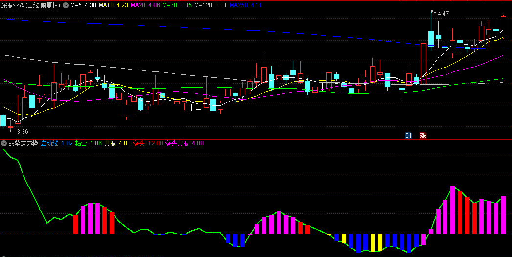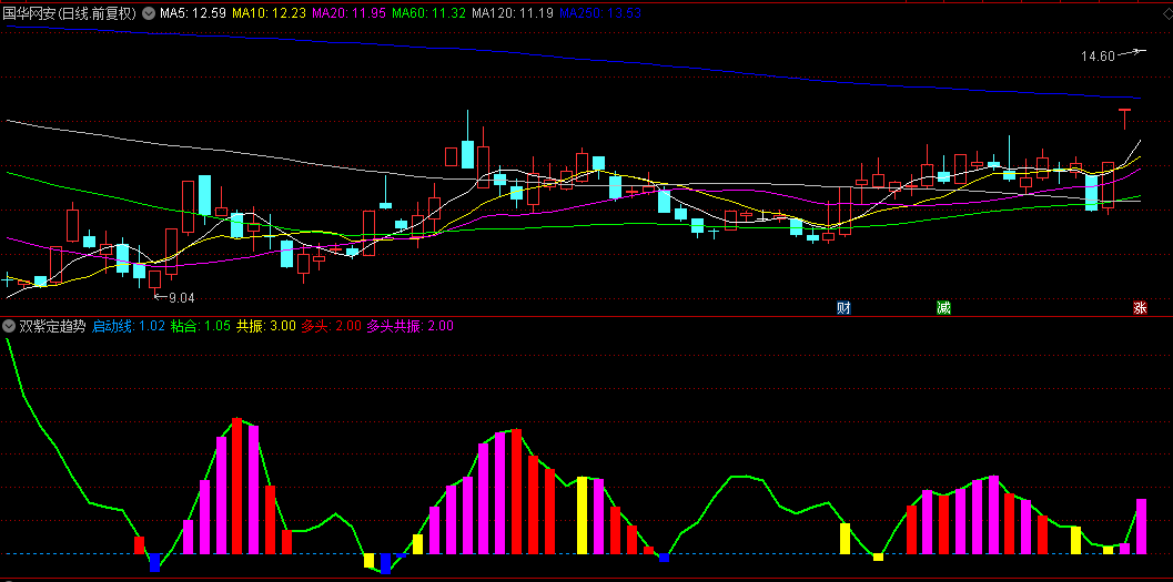 【双紫定趋势】副图/选股指标,出紫色柱子,在5日,10日均线附近低吸!