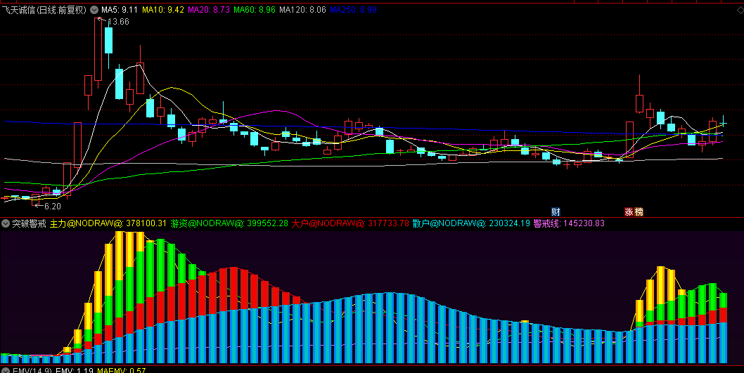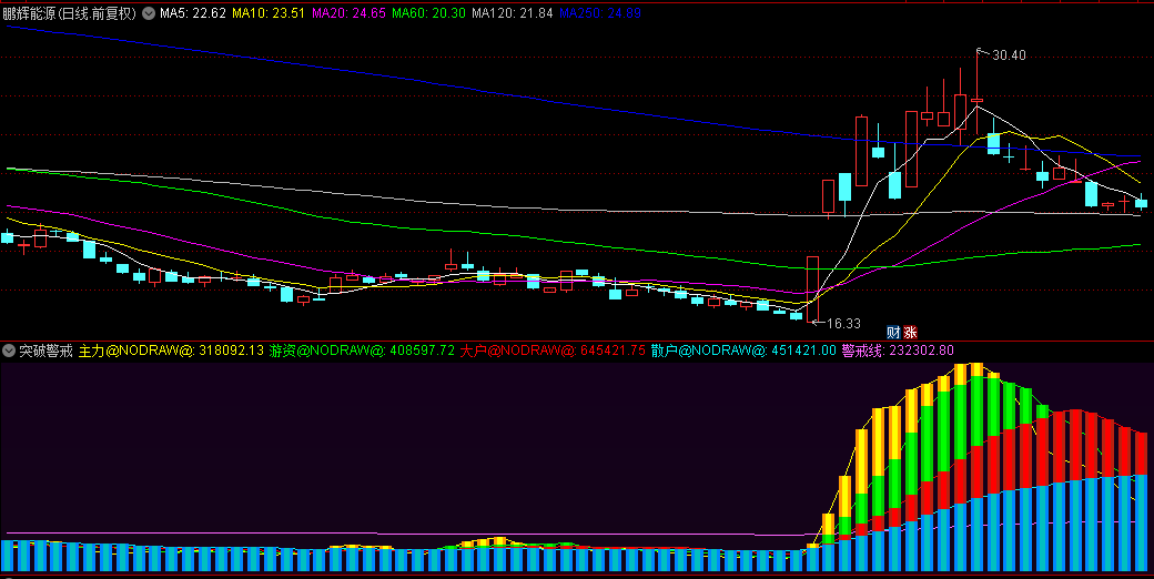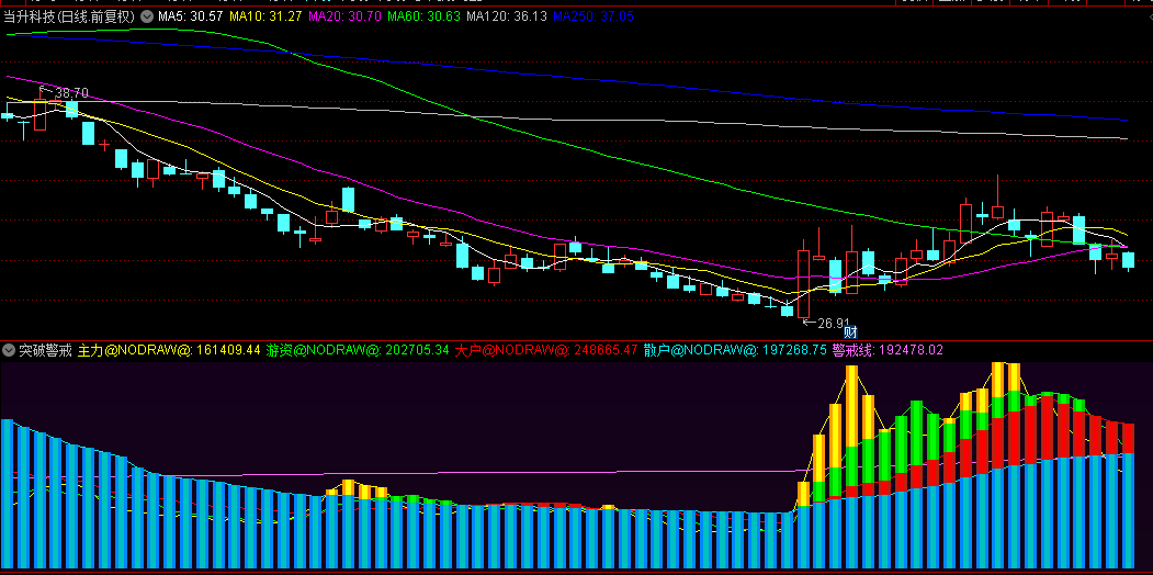 这就配合到一个资金的指标了,突破警戒。此指标的用法就是当回调出阴线,